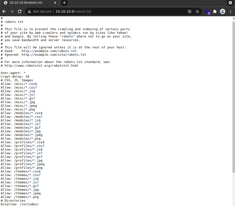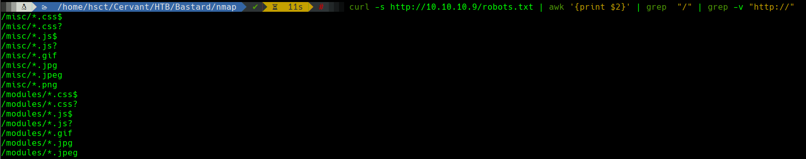 curl -s http://10.10.10.9/robots.txt | awk '{print $2}' | grep "/" | grep -v "http://" > robots.txt