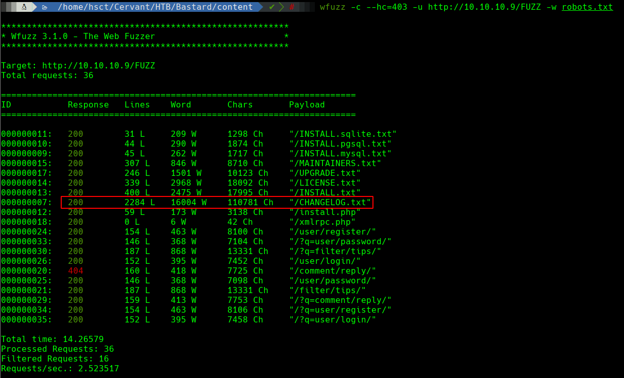 wfuzz -c --hc=403 -u http://10.10.10.9/FUZZ -w robots.txt