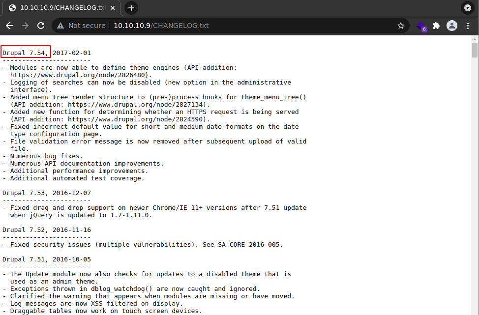 De aquí, lo que nos interesa es saber la versión de Drupal, para esto, la mejor opción es acceder al changelog.