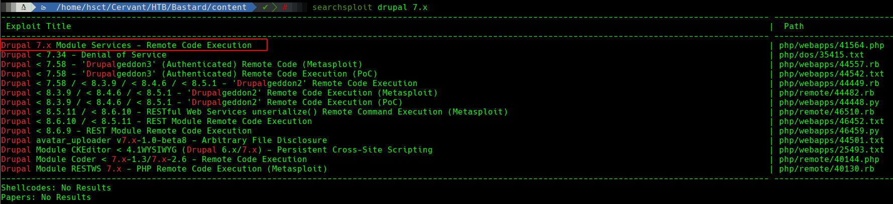 Ahora que sabemos que versión de Drupal está instalada en la máquina víctima, buscaremos posibles exploits en exploitdb.