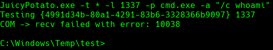 Pero recibimos el mensaje recv failed with error: 10038. En este caso, tendremos que proporcionar un CLSID que sea compatible con la versión de S.O. de la máquina víctima. Este valor se puede buscar desde el mismo repositorio de JuicyPotato