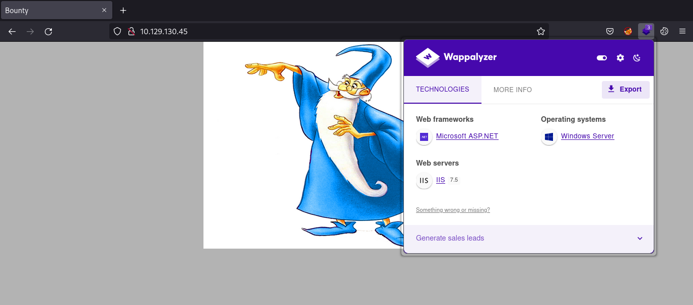 Investigando la página web nos encontramos con una imagen de merlín y podemos identificar que estamos ante un servidor web IIS 7.5 como fué reportado anteriormente por nmap. Adicionalmente vemos que la web está construida con ASP.NET.