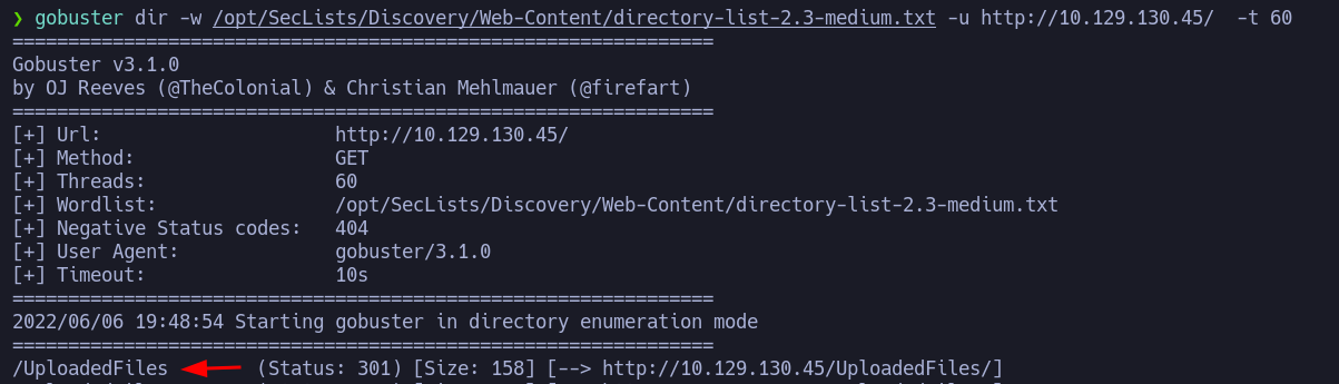 Sin mucho más que ver, procederemos a lanzar un escaneo de directorios con gobuster. Encontramos la ruta /UploadedFiles a la cual no podremos acceder de momento.