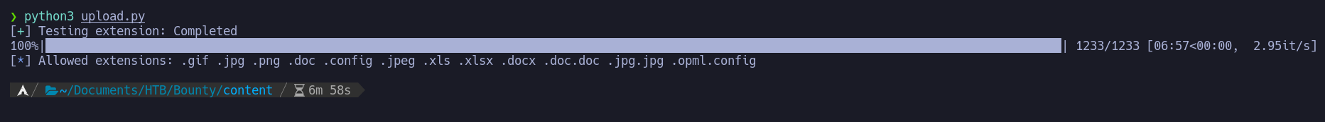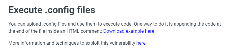 Al cabo de unos minutos obtendremos todas las extensiones válidas encontradas dentro del diccionario. De las encontradas .config llama inmediatamente la atención. Según HackTricks es posible ejecutar comandos a través de un archivo con esta extensión.