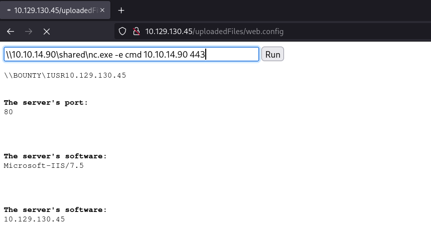 Para la intrusión, ya asumiendo que podemos ejecutar comandos, nos entablaremos una reverse shell utilizando nc.exe compartido a través de smb. Para localizar el archivo, podemos intuir que este se encuentra en la ruta /uploadedFiles encontrada anteriormente en la fase de enumeración.