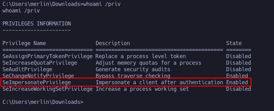 Ya una vez dentro, realizando una enumeración básica, podemos ver que el usuario merlin posee privilegio SeImpersonatePrivilege que nos permite ejecutar comandos como Administrador utilizando herramientas como JuicyPotato o PrintSpoofer.