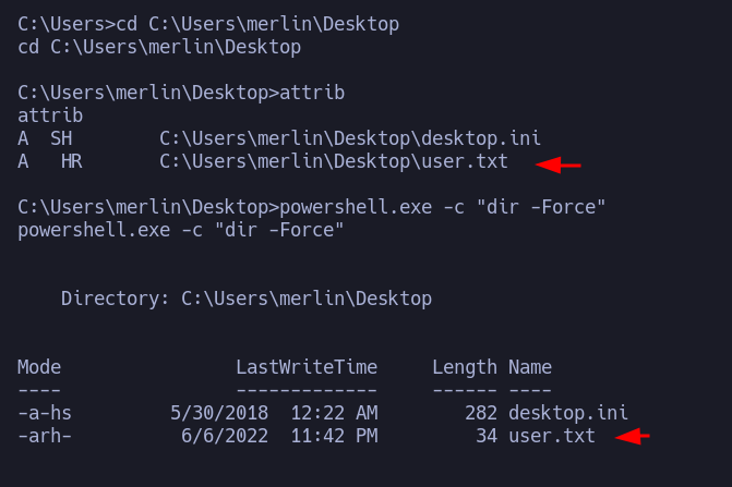 La flag del usuario podremos encontrarla con el commando attrib o dir -Force ya que se encuentra oculta.