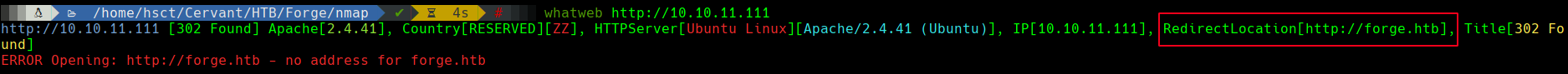 Iniciando con whatweb se detecta que la página web redirecciona hacia el nombre DNS forge.htb.