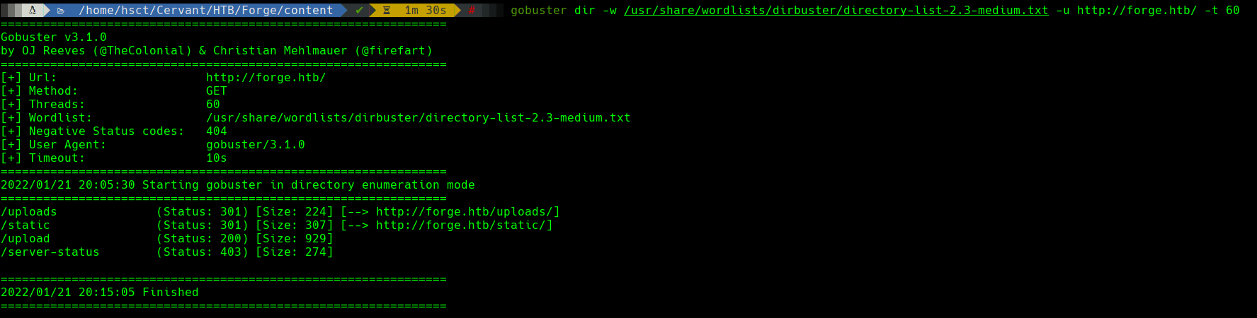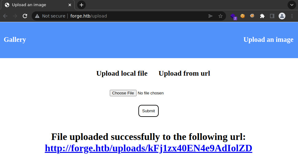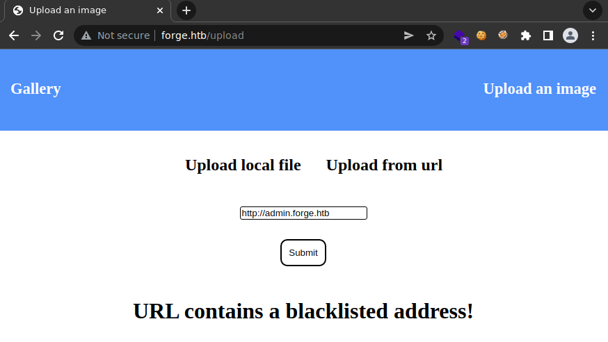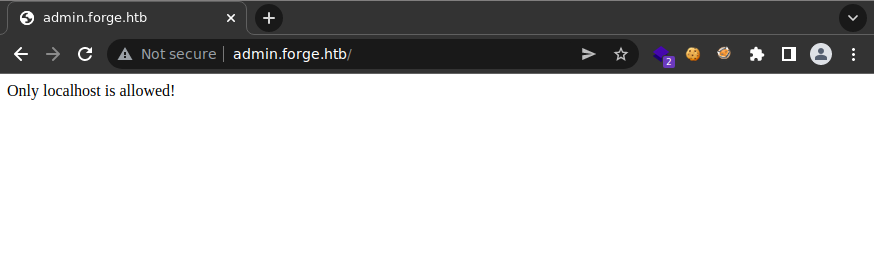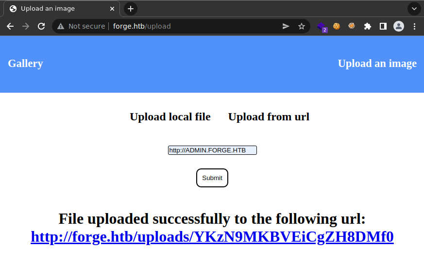 Ahora que sabemos que admin.forge.htb solo se puede acceder localmente y tenemos una vía potencial de “leer” URL con la herramienta upload, intentaremos consultar este recurso y obtener información.