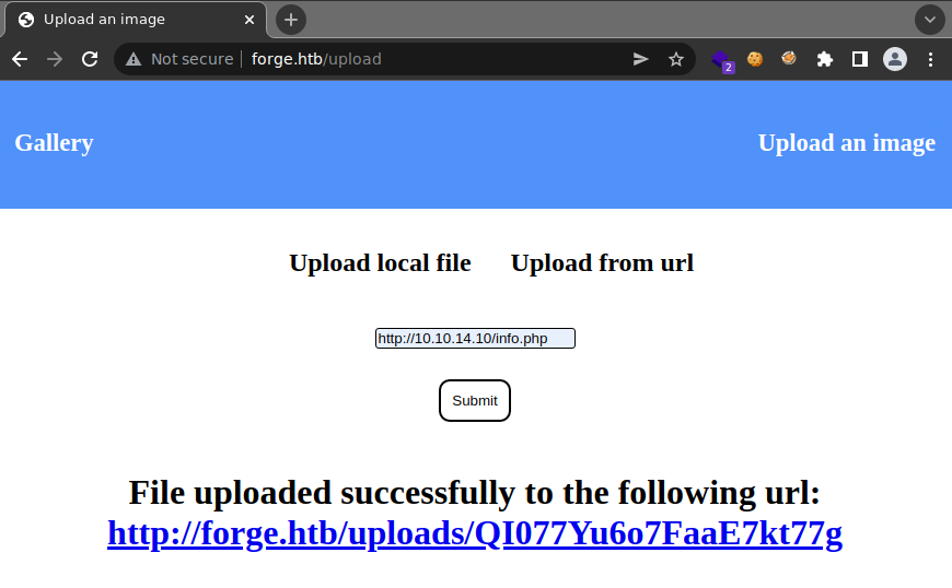 Ahora utilizando el método Upload from url testearemos como se comporta y si es posible explotarlo. Para esta prueba, levantaremos un servidor web con php para exponer el archivo info.php y consultarlo desde forge.htb