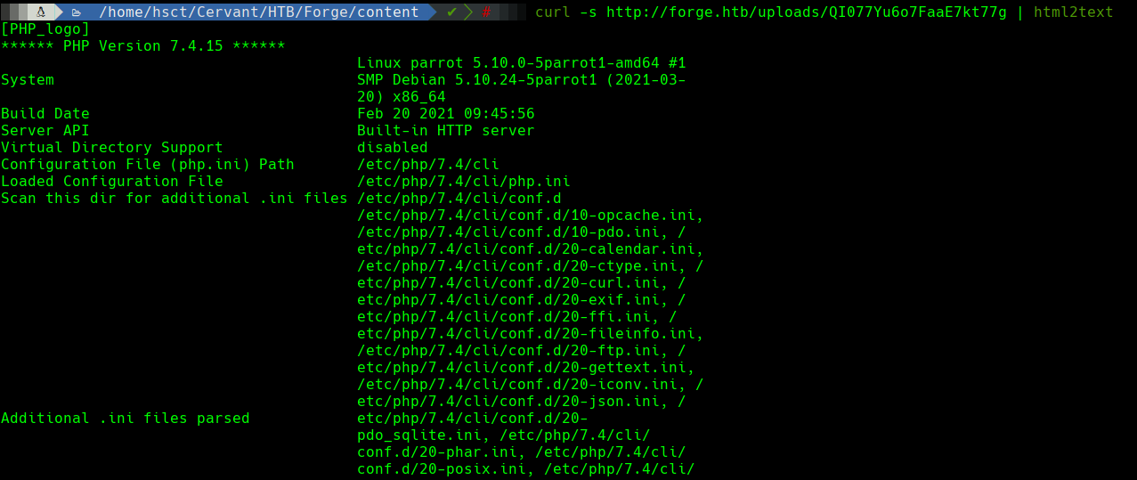 Al abrirlo, descubrimos que el archivo existe pero no muestra ningún contenido. Sin embargo, al realizar un curl, vemos el phpinfo. Lo interesante de esto es que no se interpreta el código en la máquina Forge, por lo tanto no funcionará como RFI, pero si que permite leer la data de una URL dada.