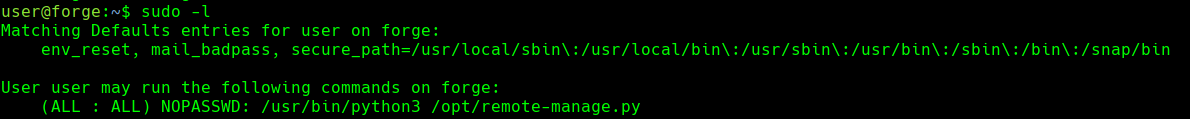 Una vez dentro, listando los permisos nos encontramos con el script /opt/remote-manage.py que nuestro usuario puede ejecutar como root.