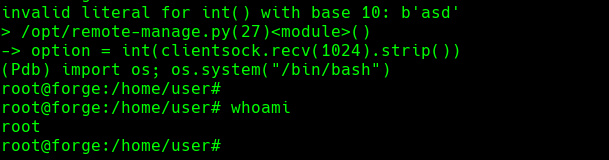 Por lo que se puede ver en el código, existe una porción en donde posterior a una excepción, se gatilla la ejecución de pdb. Sabiendo que el script se ejecuta como el usuario root, esto se puede explotar para lanzar una consola bajo ese contexto privilegiado.