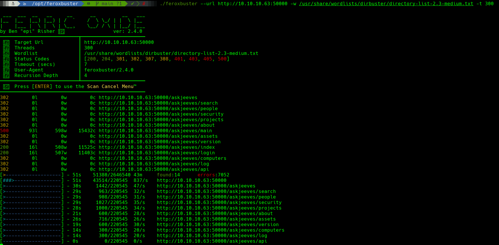 ./feroxbuster --url http://10.10.10.63:50000 -w /usr/share/wordlists/dirbuster/directory-list-2.3-medium.txt -t 300