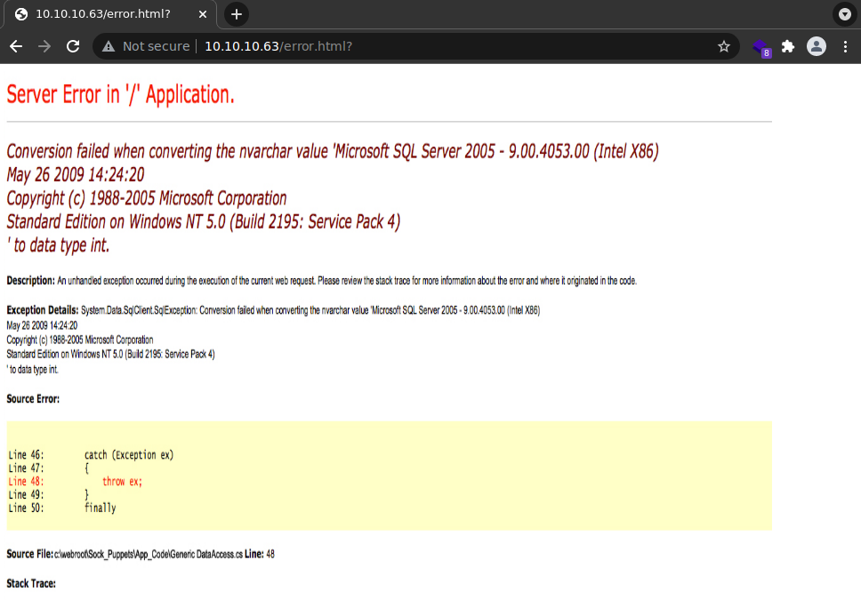 Sin embargo, al darle al botón Search nos redirige a https://10.10.10.63/error.html y nos arroja un error.