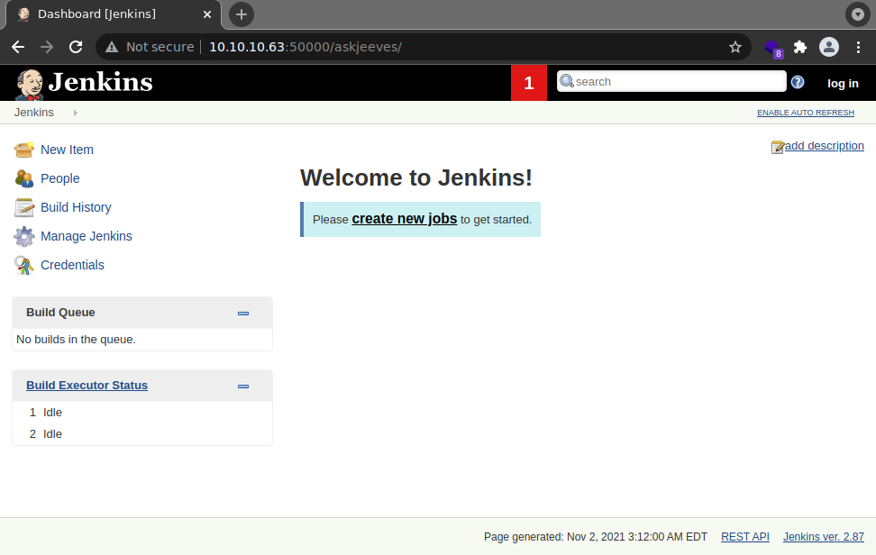 Un Jenkins de versión 2.87. Como primer paso buscamos vulnerabilidades asociadas en exploitdb sin tener éxito.