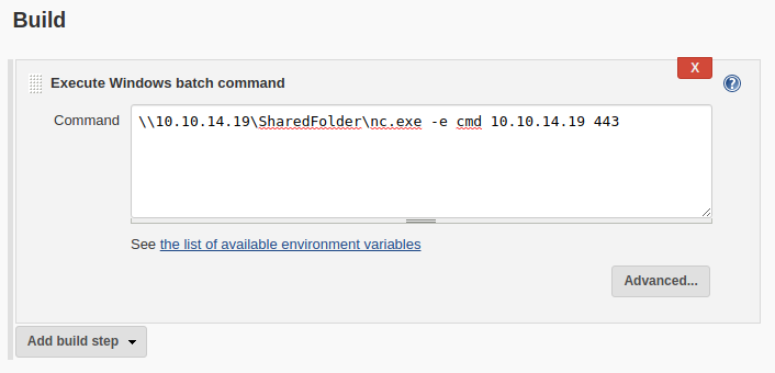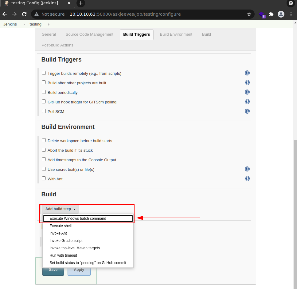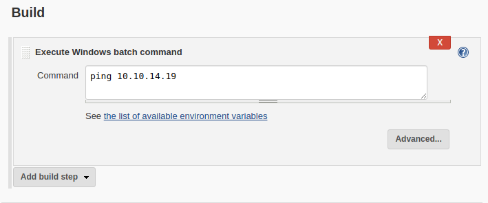 En la sección Build especificamos que durante la ejecución de la tarea, queremos lanzar comandos de Windows.
