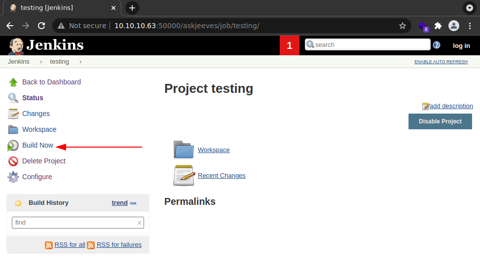 Una vez que escribimos la instrucción, guardamos el proyecto y le damos a Build Now.