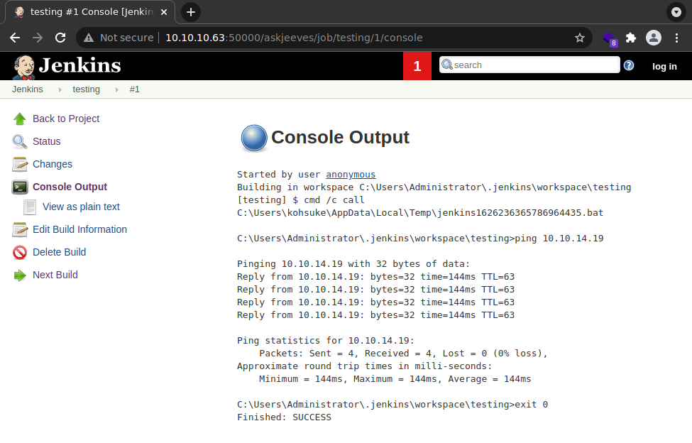 Vamos a Console Output y validamos que efectivamente el ping se emitió sin problemas.