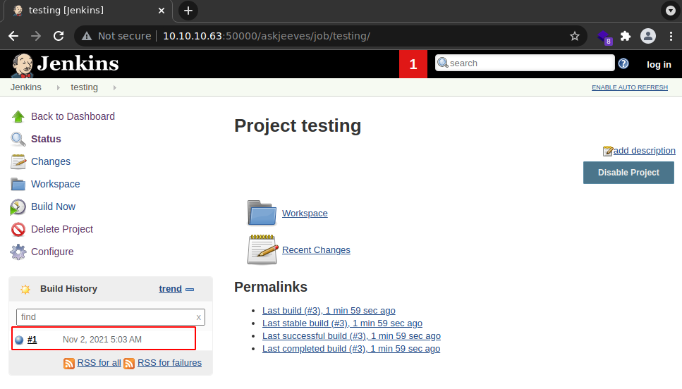 Posteriormente veremos una entrada en el Build history, clikamos ahí y entraremos al detalle de la ejecución de nuestra tarea.