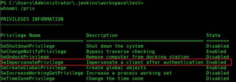 Validamos que estamos en una máquina Windows 10 Pro de 64 bits y ésta mantiene el permiso SeImpersonatePrivilege habilitado. Sabiendo esto, podríamos intentar utilizar Juicy Potato para explotarlo.