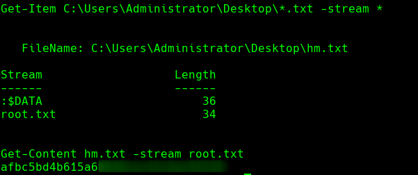 Como se ve en la imagen, el archivo hm.txt contenía un stream llamado root.txt con el hash de la flag en su interior.