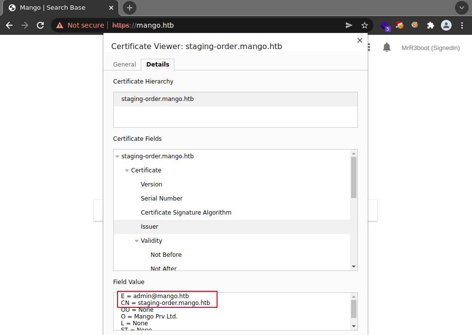 Por otro lado y recordando que el puerto 443 se encuentra expuesto, sería recomendable revisar el certificado SSL del sitio para extraer información.