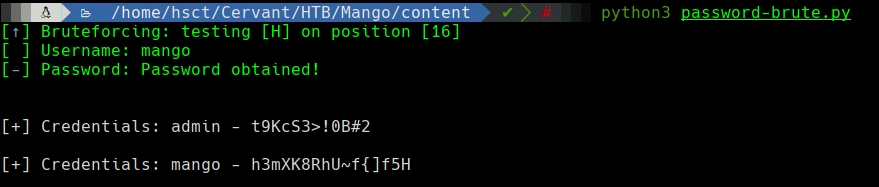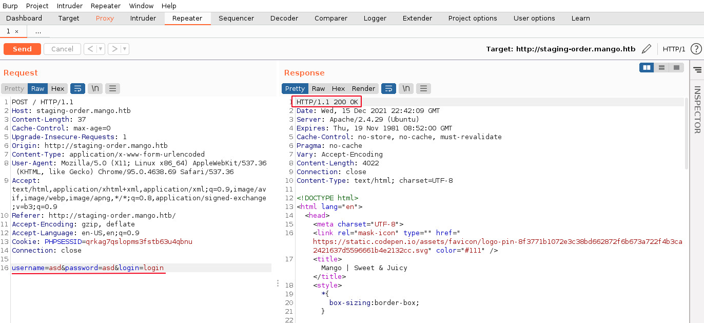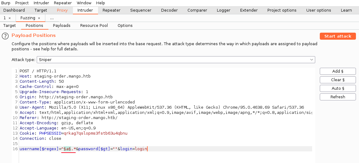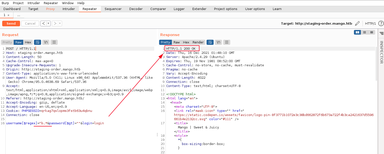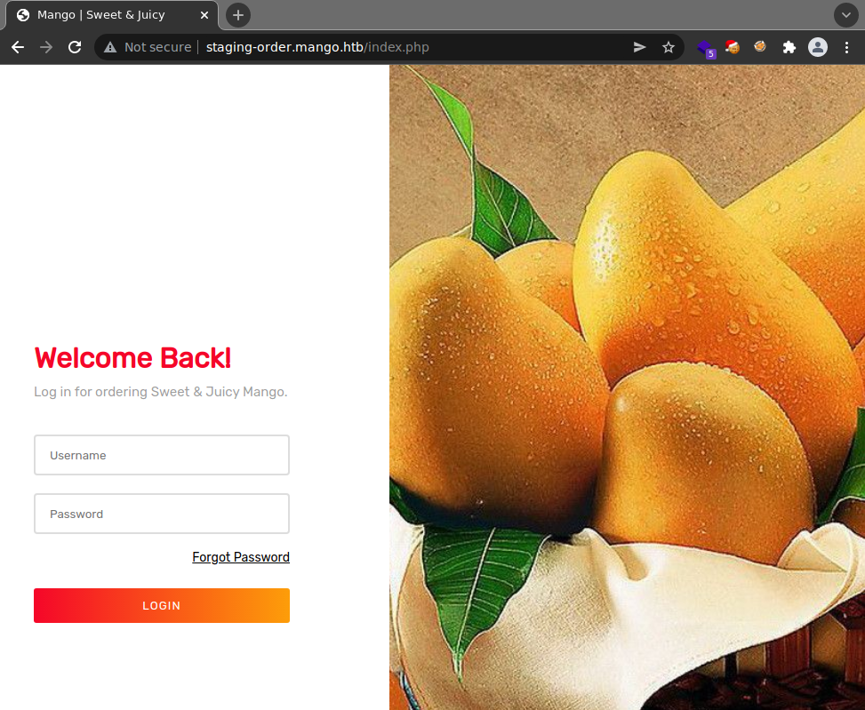 Partiendo desde el panel de login descubierto en http://staging-order.mango.htb/index.php, después de muchos intentos fallidos de inyección XXS y SQLi descubrimos que la base de datos es una del tipo no relaciónal NoSQL. Se puede inferir que se trata de MongoDB debido a la similitud con el nombre de la máquina.