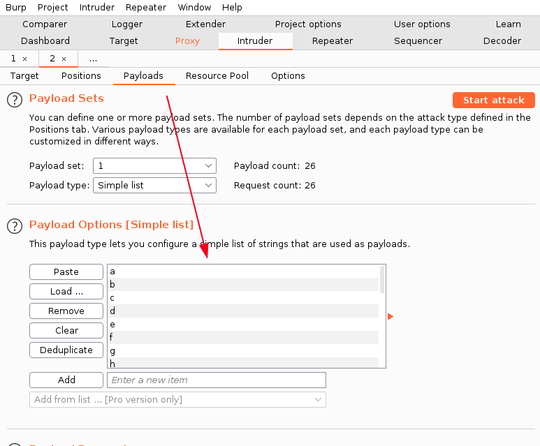 Y en Payloads cargaremos el diccionario char.txt de SecLists.