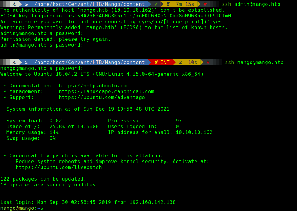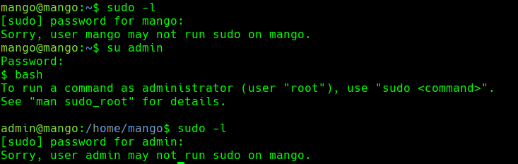 En el caso del user admin vemos que nos rechaza la conexión por SSH, pero es posible cambiar a éste user una vez logueados con el user mango.