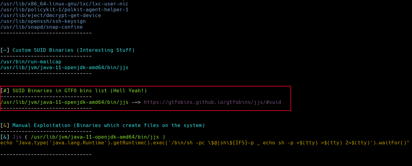 Encontramos el binario jjs con permiso SUID. Esto se puede explotar fácilmente utilizando GTFObins.