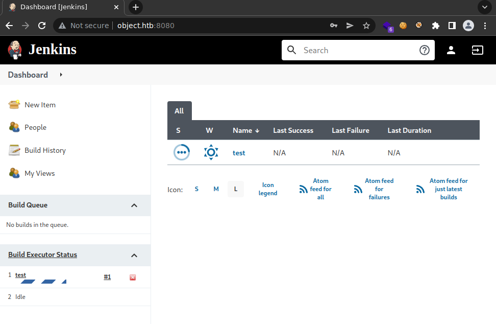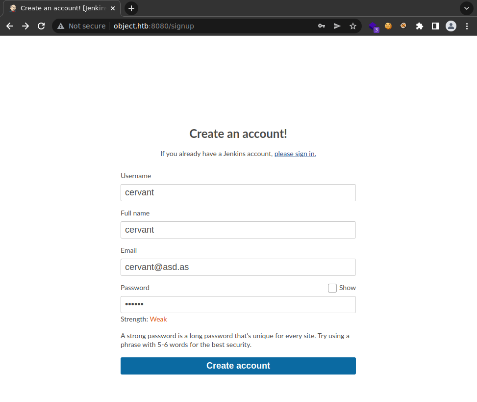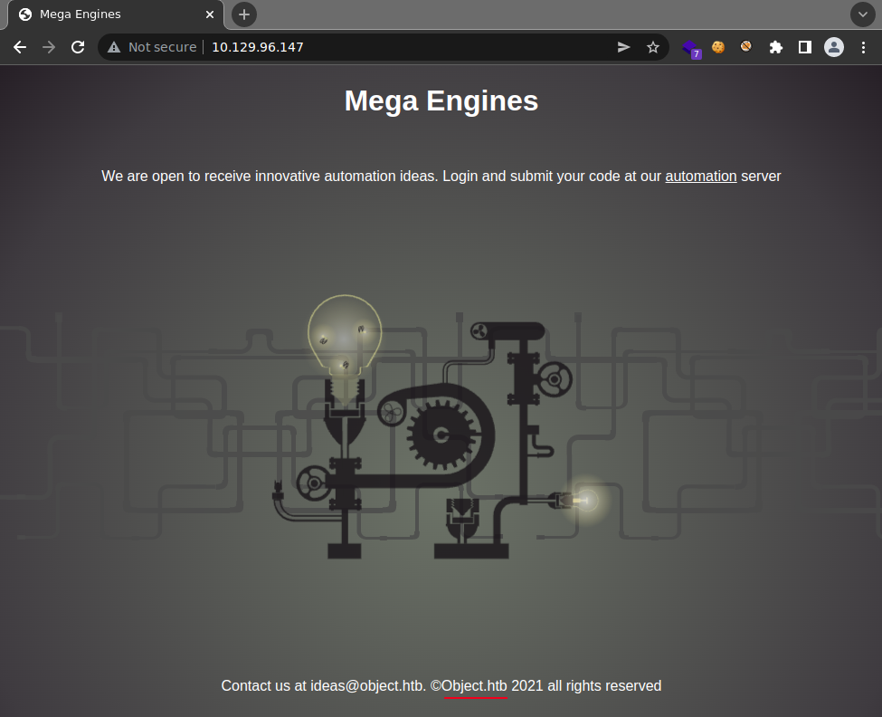 Lo primero que visualizamos es una web que nos indica el dominio object.htb en su pie de página y un enlace hacia su automation server que nos redirige hacia object.htb:8080. Esto inmediatamente lo incorporamos al archivo /etc/hosts.
