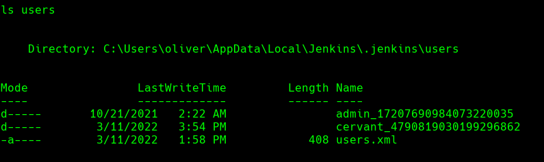 Una vez dentro, nos encontraremos en el directorio C:\Users\oliver\AppData\Local\Jenkins\.jenkins\workspace\test. Si volvemos al root de Jenkins podremos ubicar los archivos necesarios para descifrar las contraseñas de los usuarios creados. Para esto, requeriremos los archivos credentials.xml, master.key y hudson.util.Secret, el primero se encontrará en el directorio personal del usuario y los otros en el directorio secret.
