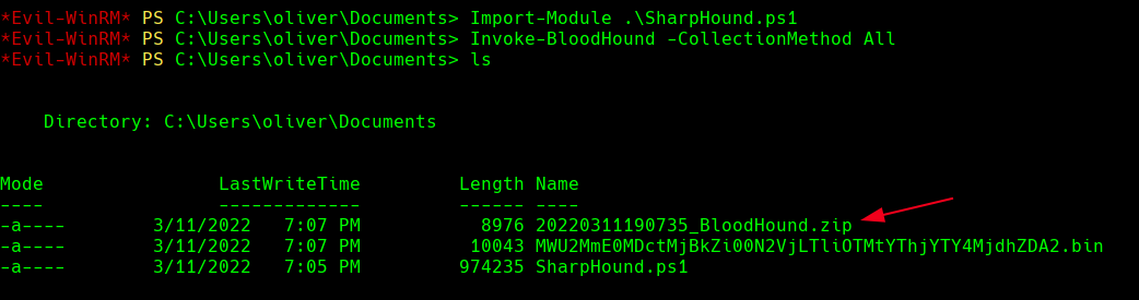 Subiremos el archivo con el comando upload nativo de Evil-WinRM, importaremos el módulo y lo ejecutaremos llamándo a la función Invoke-BloodHound -CollectionMethod All. Generará un archivo comprimido con toda la data recolectada.