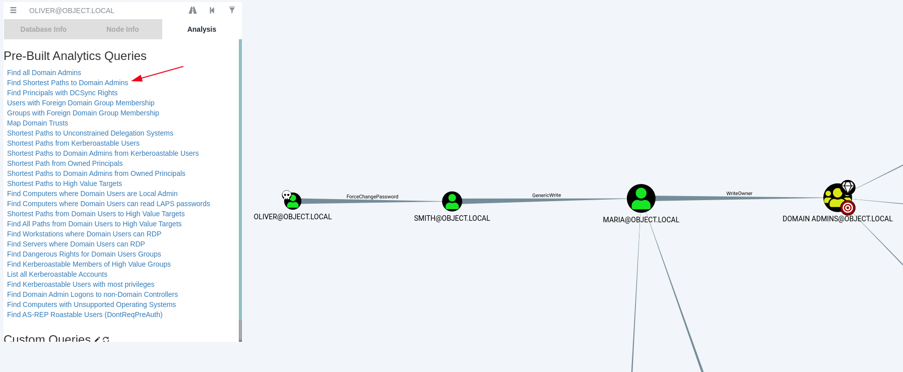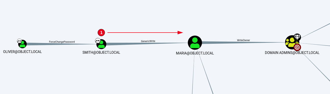 Como se puede apreciar, nos entrega una ruta bastante directa en donde tendremos que pivotear a través de los usuarios smith y maria antes de llegar a Administrador de Dominio.