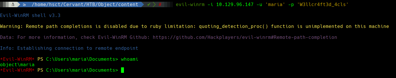 Luego de validar las contraseñas contra WinRM, verificamos que W3llcr4ft3d_4cls es la correcta para maria.