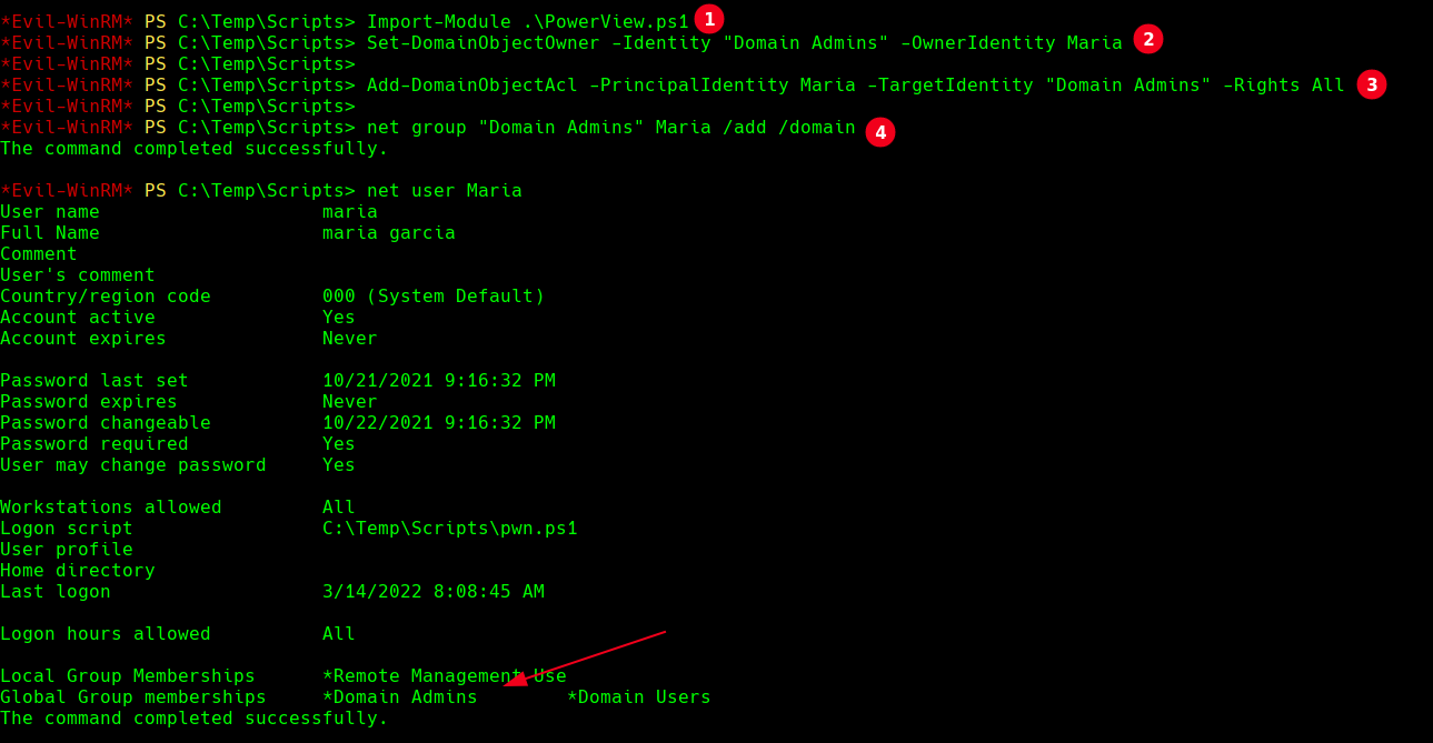 Add-DomainObjectAcl -PrincipalIdentity maria -TargetIdentity "Domain Admins" -Rights All