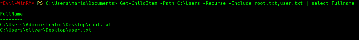 Get-ChildItem -Path C:\Users -Recurse -Include root.txt,user.txt | select Fullname