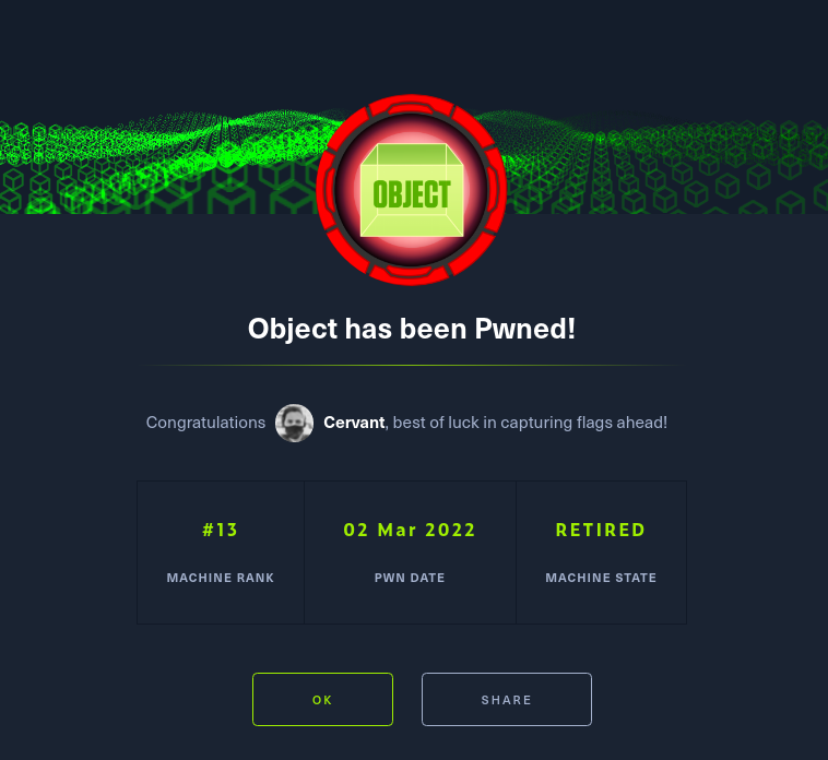 Object es una máquina Windows de dificultad Hard de la plataforma de Hack The Box, incluye conceptos de explotación de Active Directory, Bypass de Firewall y ejecución de jobs en Jenkins.