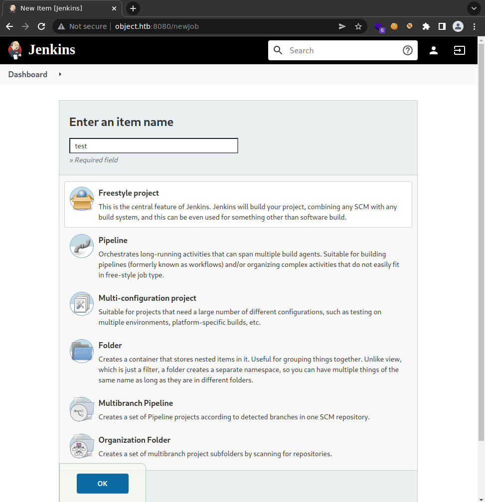 Crearemos un job llamado test de tipo Freestyle project y le daremos OK.